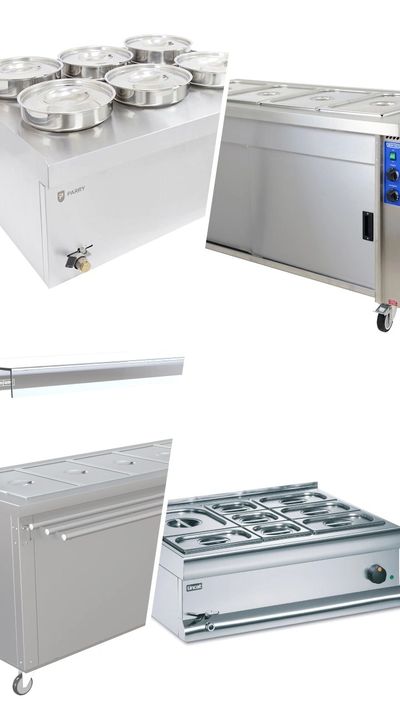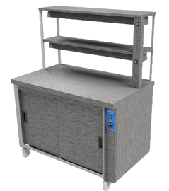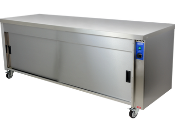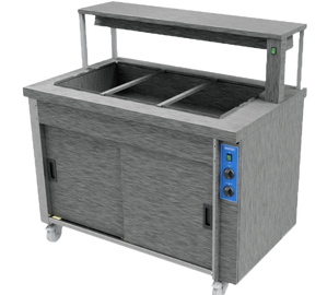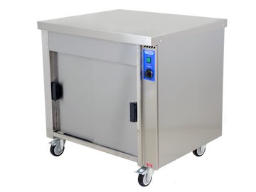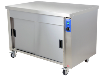 Hot cupboards can be plain top, bain marie or hot plate. Usually used as a stationary item of equipment with shelves, heated gantry or lights above.